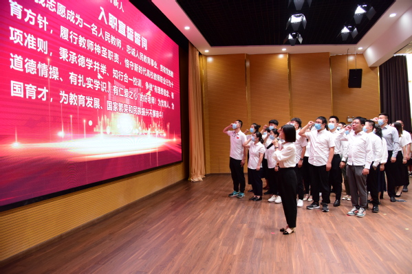 在领誓人卜洪璇老师的带领下,新进教师庄严宣誓,掷地有声的誓词、紧握高举的右拳,是每一位新进教师的自我期许,更是对高校教育事业的庄严承诺。