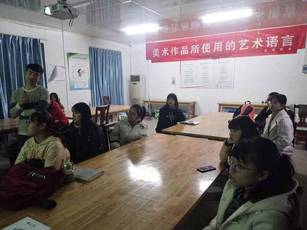 鉴赏过程中,同学们围绕国内画家的绘画艺术展开积极互动,在你来我往中共同感受“美的存在感动绘画人,同时绘画人又将美传达给大众,从而产生艺术的共鸣”的艺术精神。同学们因为兴趣爱好聚在一起,学习过程中大家更多的会用世俗的眼光判断画作“美丑”,而严重忽视了作品的内在含义。赵兴明以《训子图》为例,公鸡带小鸡的场景虽然称不上超凡脱俗,却能让大家深深的感受到父亲教训孩子的场面,这就是艺术,艺术也是一种如同语言般的表达方式。