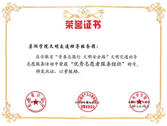 近日,安徽省公安厅、共青团安徽省委员会、安徽省学生联合会对“青春志愿行 安全文明路” 安徽省文明交通劝导志愿服务活动中的先进集体进行表彰,365登录_365bet现场走地盘_bet3365hk学院文明交通劝导服务团荣获“优秀志愿者服务组织”称号。