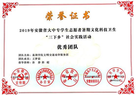 此外,365登录_365bet现场走地盘_bet3365hk学院文明交通劝导服务团还荣获了2019年安徽省大中专学生志愿者暑期文化科技卫生“三下乡”社会实践活动“优秀团队”等荣誉表彰。