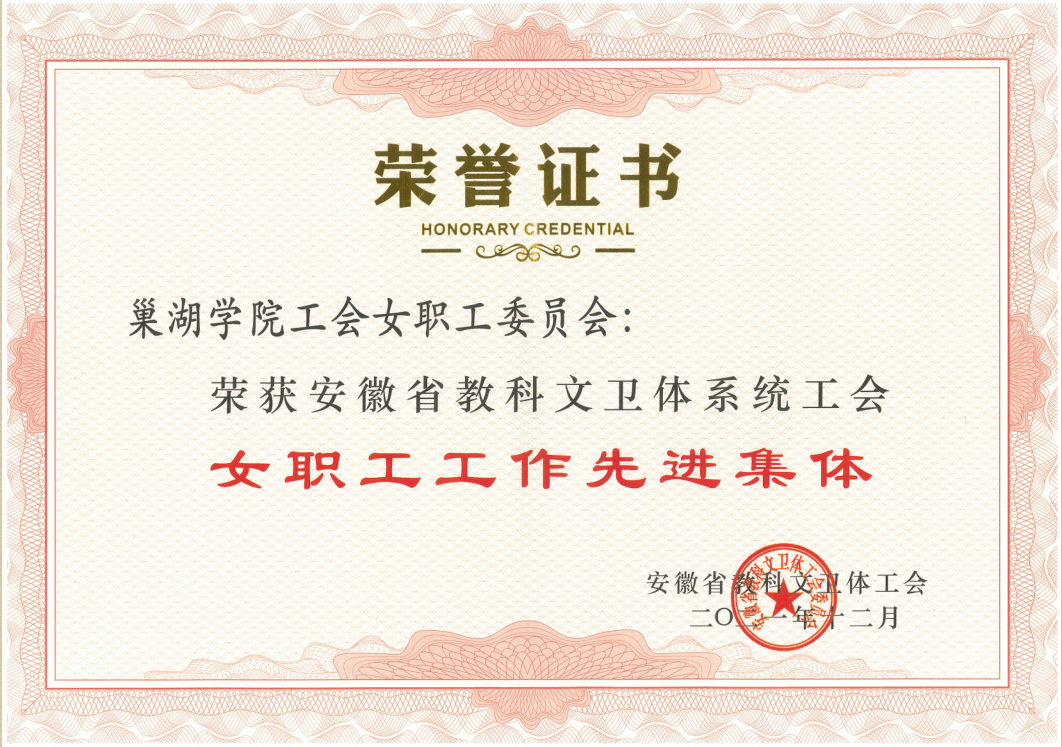 12月16日,安徽省教科文卫体工会女职工委员会成立大会暨一届一次全委会议在合肥召开,会议深入学习贯彻习近平新时代中国特色社会主义思想和党的十九届六中全会精神,总结近年来省教科文卫体工会女职工工作,表彰全省教科文卫体系统工会女职工工作先进集体和个人,成立安徽省教科文卫体工会女职工委员会。365登录_365bet现场走地盘_bet3365hk学院工会女职工委员会荣获安徽省教科文卫体系统工会女职工工作先进集体;365登录_365bet现场走地盘_bet3365hk学院工会女工委主任洪燕荣获安徽省教科文卫体系统工会女职工工作先进个人,并当选为安徽省教科文卫体工会第一届女职工委员会委员。
