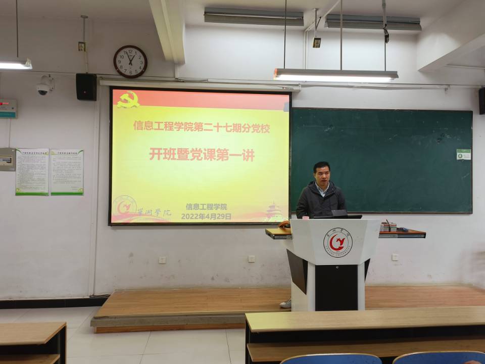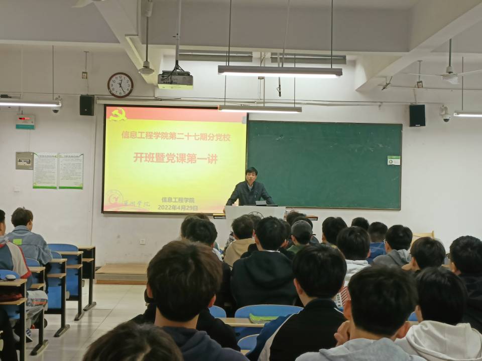 为端正同学们的入党动机,培育一批具有坚定理想信念、爱党爱国的后备力量,信息工程学院于4月29日中午12:30在慎思楼中103举办第二十七期党校开班典礼。开班典礼由第二十七期党校班主任樊乐乐主持,出席典礼的有信息工程学院党委书记郑尚志以及本期83名入党积极分子。