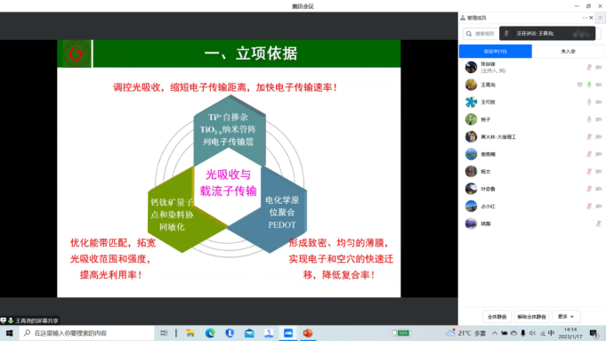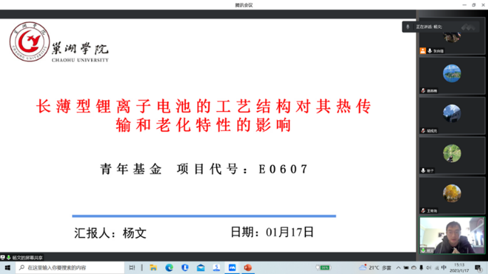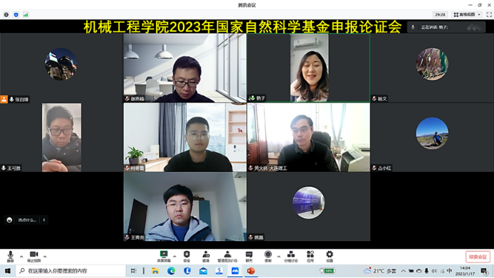 为做好2023年度国家自然科学基金项目申报工作,提高项目申报质量,机械工程学院于1月17日下午组织召开了2023年度国家自然科学基金项目申报线上论证会议。会议邀请了上海交通大学胡成亮教授、大连理工大学黄火林教授、南京航空航天大学占小红教授和南京邮电大学谢燕楠教授作为论证专家为项目申报把脉问诊。校科技处处长姚磊,机械工程学院副院长张自锋,安徽省高效智能光伏组件工程研究中心主任王可胜教授,项目申请人王青尧博士、叶奇鲁博士和杨文博士等参会。会议由机械工程学院院长许雪艳主持。