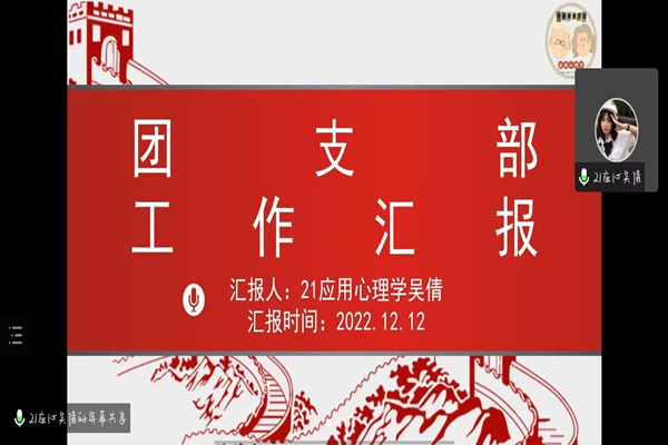 为贯彻落实全面从严治团要求,切实抓好团干部队伍建设,激发基层团支部活力,12月12日中午12:30,教师教育学院在线上召开2022年度团支部书记述职评议会,教师教育学院党委副书记左劲中、团委副书记汤重、辅导员曾鹏、陈高言出席会议,各班级团支部书记准时参会。