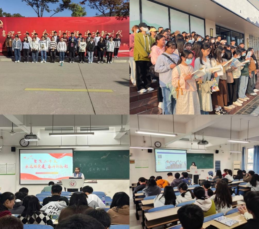 各团支部积极开展“学习二十大,永远跟党走,奋斗新征程”主题团日活动。通过重温入团誓词、读党史、诵读红色经典诗歌等活动,充分发挥组织化学习优势,带领团员青年一起学习党的二十大报告,引导广大团员青年从党的二十大精神中汲取力量。比如:22级旅游管理一班团支书以PPT形式带领班级同学学习了二十大报告的主要内容,并号召全体团员弘扬伟大建党精神,牢记初心,不忘使命,向新征程奋进;22级会展经济与管理班全体同学深情合唱了歌曲《我和我的祖国》,用美好的歌声表达了对祖国的美好祝福。