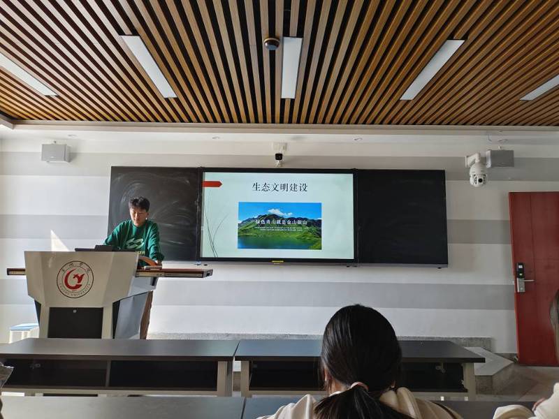 首先,凡卫东给大家介绍了生态文明建设的目的及意义,围绕着“绿色发展、资源节约、环境保护”等专题来让同学们提高对生态文明建设的认知度。随后,他带领我们学习了关于习总书记对生态文明建设的重要讲话,强调了习总书记所说的“绿水青山就是金山银山”,希望各位同学能够节约资源,保护资源。最后,他说道我们每个人都要做生态文明建设的实践者、推动者,促进人与自然双向奔赴,和谐共生。