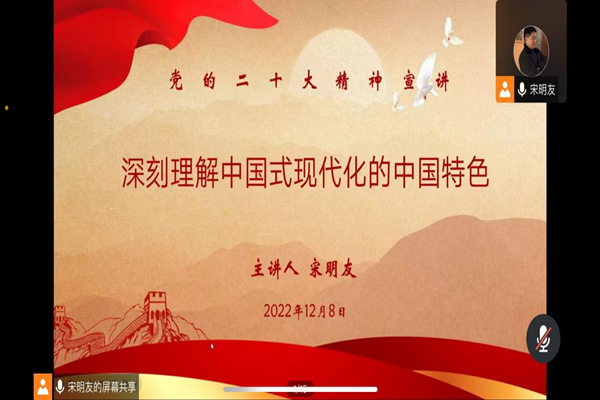 12月8日中午,体育学院业余党校第三十期党课培训第一讲暨“党的二十大精神宣讲”主题党课于线上腾讯会议举行,本次党课培训由体育学院党委副书记宋明友授课,全体入党积极分子参与。