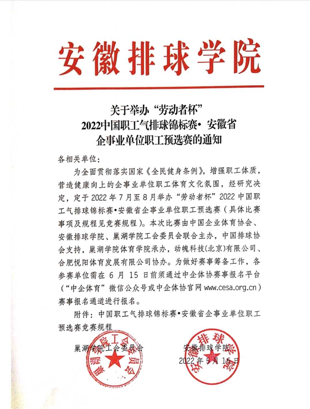 “劳动者杯” 2022中国职工气排球锦标赛•安徽省企事业单位职工预选赛竞赛规程