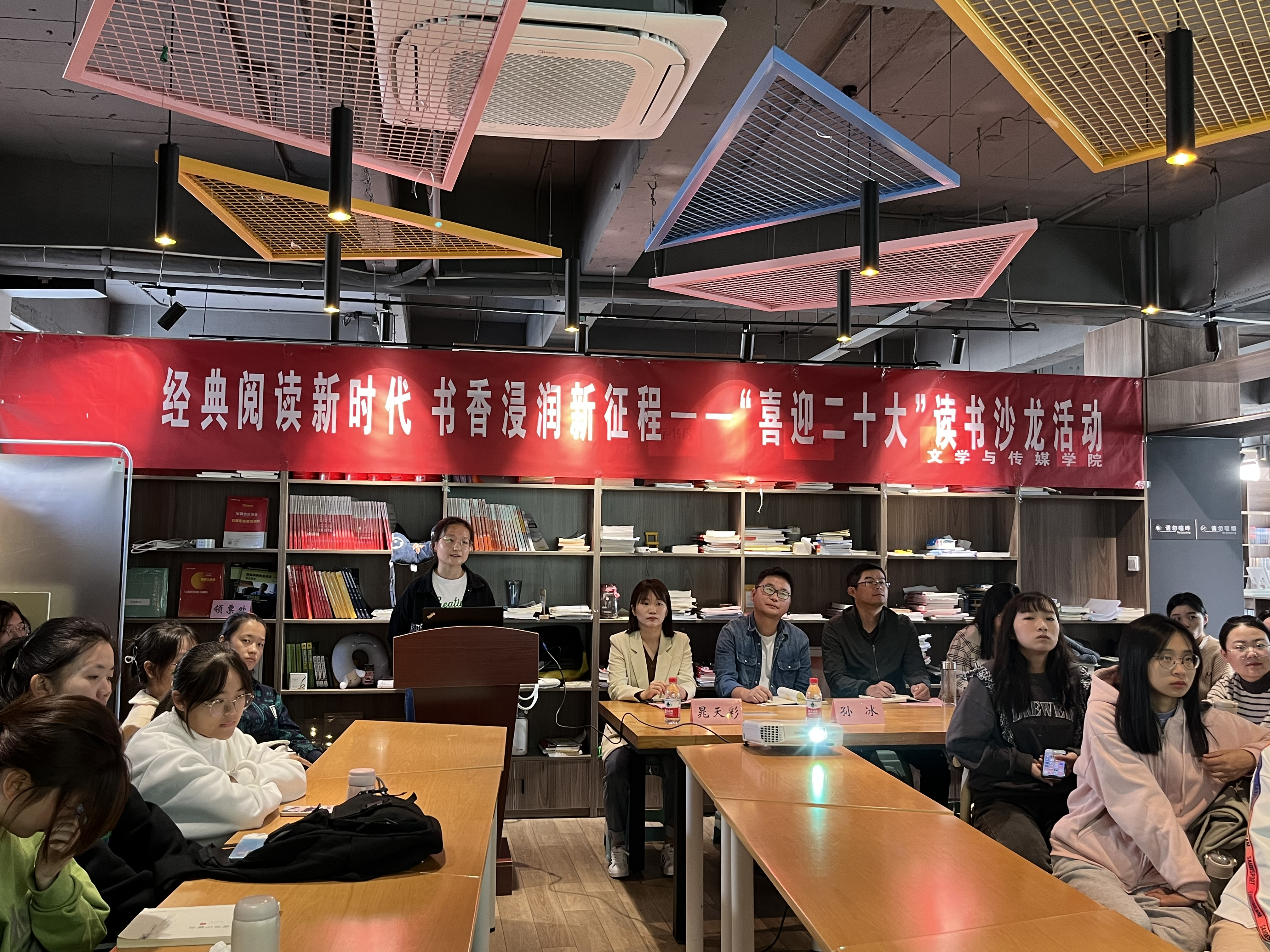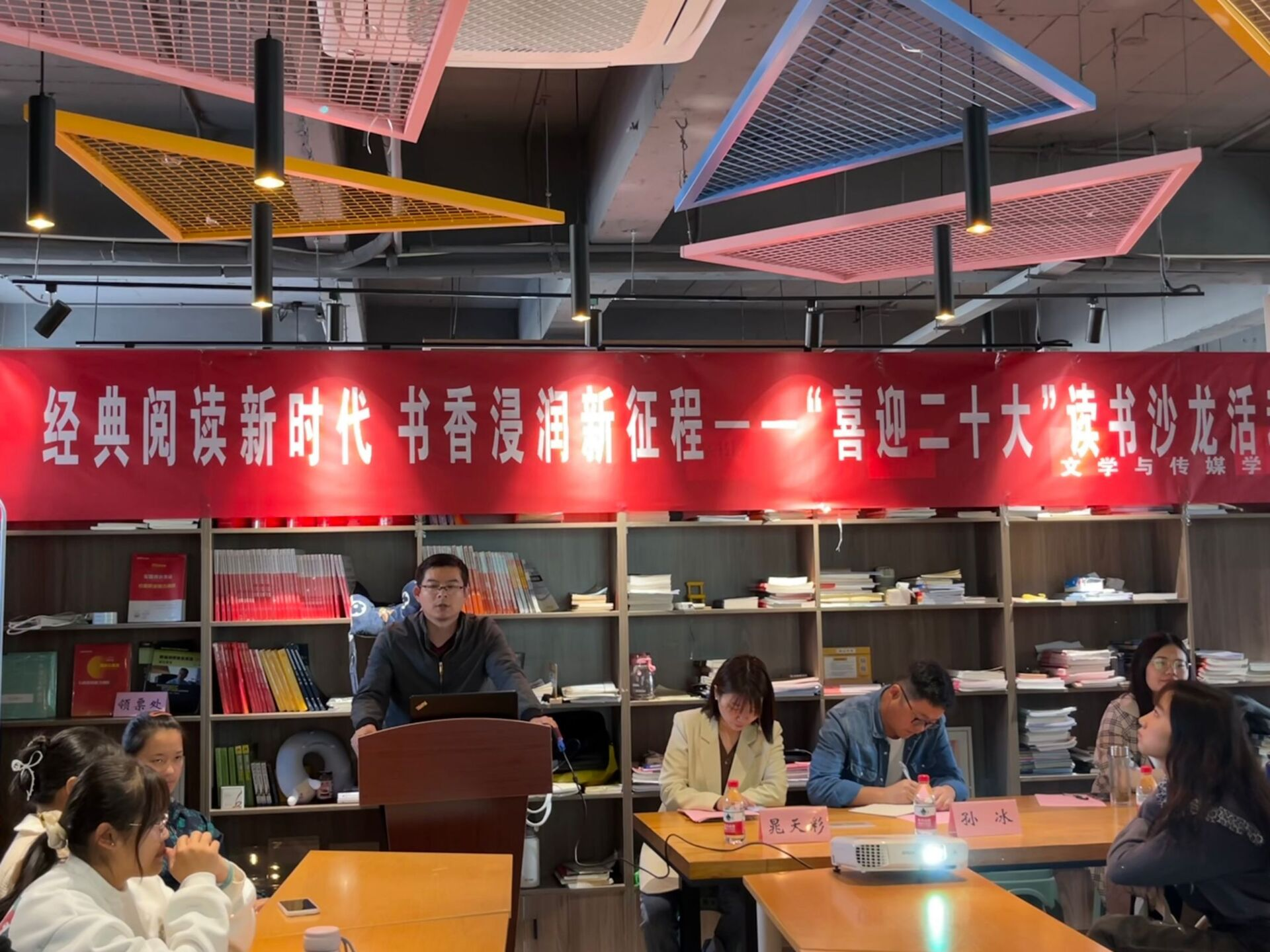 为迎接党的二十大胜利召开,营造书香校园氛围,10月14日上午8:30,文传学院在汤山书苑举办“经典阅读新时代,书香浸润新征程”读书沙龙活动,文传学院党委副书记孙冰、汉语言文学教研室主任吴强、团总支负责人晁天彩、辅导员沈洁出席本次活动,安徽省校园读书创作主题征文比赛获奖学生代表、22级汉语言文学2班全体同学准时参加。