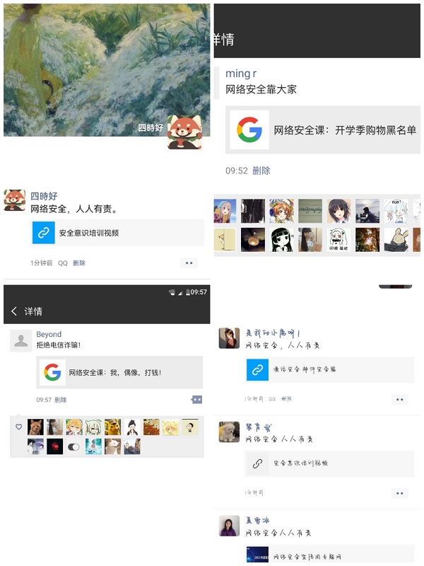 通过学院QQ、微信、易班平台,动员学生转发网络安全宣传视频,并参与#平安校园#微博话题。让每位学生都做网络安全的守卫者。