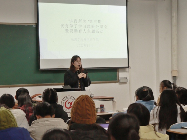 为提高大一新生的学习积极性,深刻认识大学阶段的奋斗目标,让青年学子在接下来的学习中找到适合自己的学习方法,外国语学院于11月30日晚在敏行楼110教室举行优秀学子学习经验分享会暨资助育人主题活动。本次主题活动邀请了2020级三位各类奖学金获得者分享各自的学习经验。此次活动由学院资助工作联络员李玲主持,2022级全体学生参加。