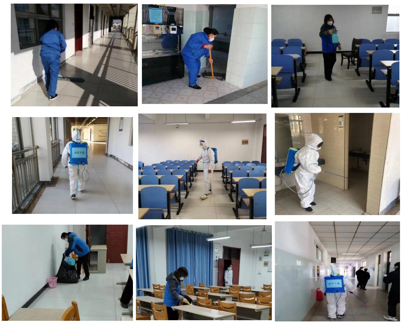 齐心协力,营造良好环境。每场考试结束后,及时、全面对所有教室、楼道、楼梯、扶手、卫生间公共区域进行清洁。并严格按照配比,做好一般场所预防性消杀和重点场所终末消杀。