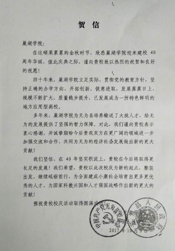 中共无为县委 无为县人民政府贺信