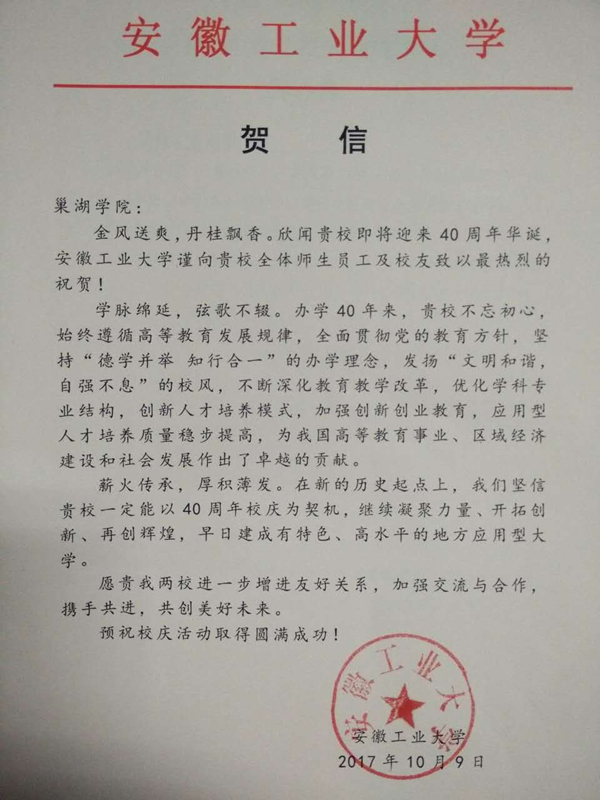 安徽工业大学贺信