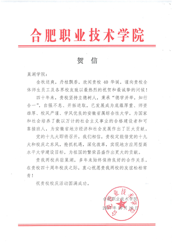 合肥职业技术学院贺信