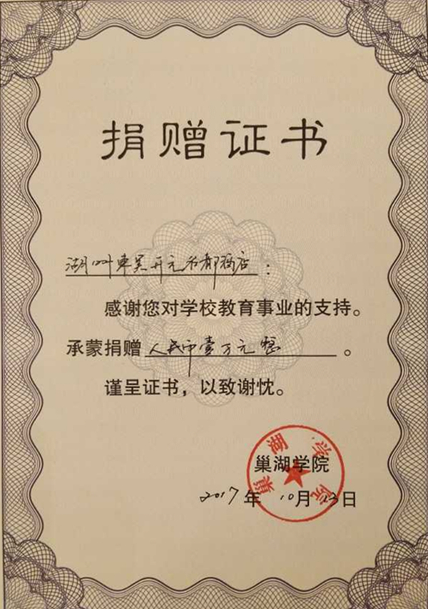 湖州东吴开元名都酒店捐助学校发展和助学资金壹万元