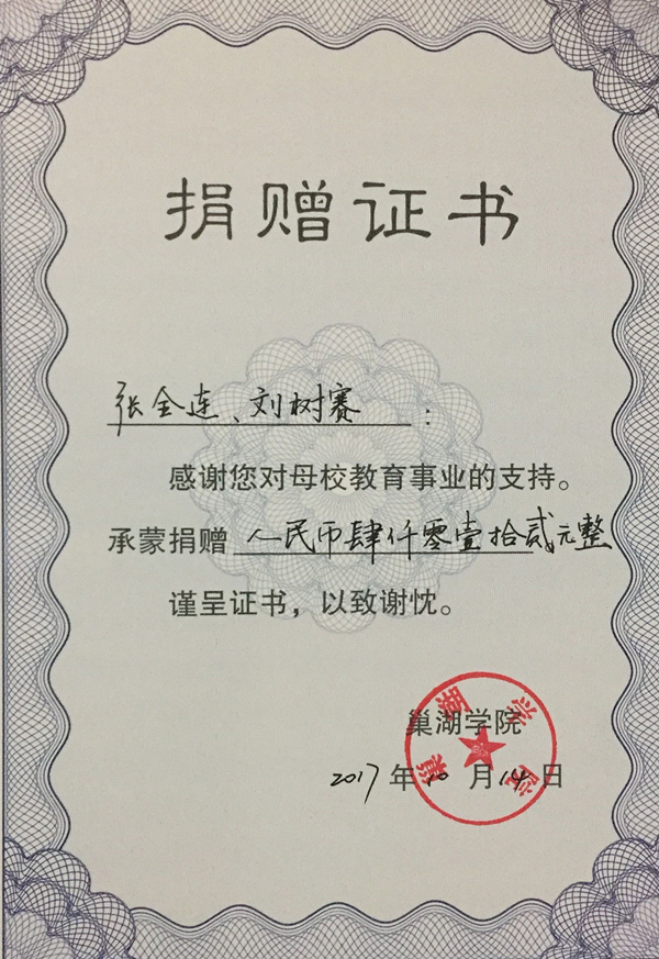 06级公共管理班校友张全连、刘树赛捐赠校名石建设资金肆仟零壹拾贰元